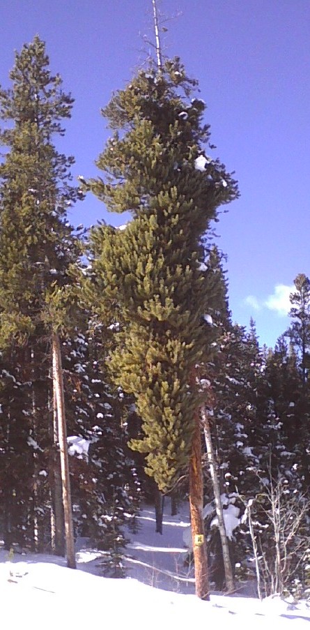 I have been teaching skiing at Aspen, based out of Buttermilk, since 1997. One day another instructor said to meet by the upside-down tree. I had skiied past it thousands of times and never really looked at it. Now I show everyone 🙂