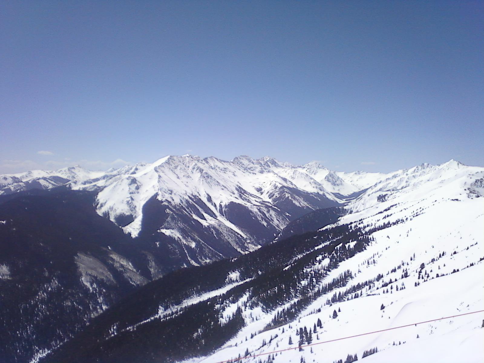 The last bonus weekend at Aspen Highlands was so great. Just perfect spring skiing. A band played at the Merry-Go-Round both days contributing to a relaxed laid-back atmosphere. Guys outdid each other off a jump at the base of Scarlett’s – my favourite was a double backflip which the guy did several times! Another highlight was the paraglider who started from partway down Scarlett’s and landed right by the Merry-Go-Round…. I hiked the Bowl Saturday – here is the view from the top to the left of Pyramid Peak.