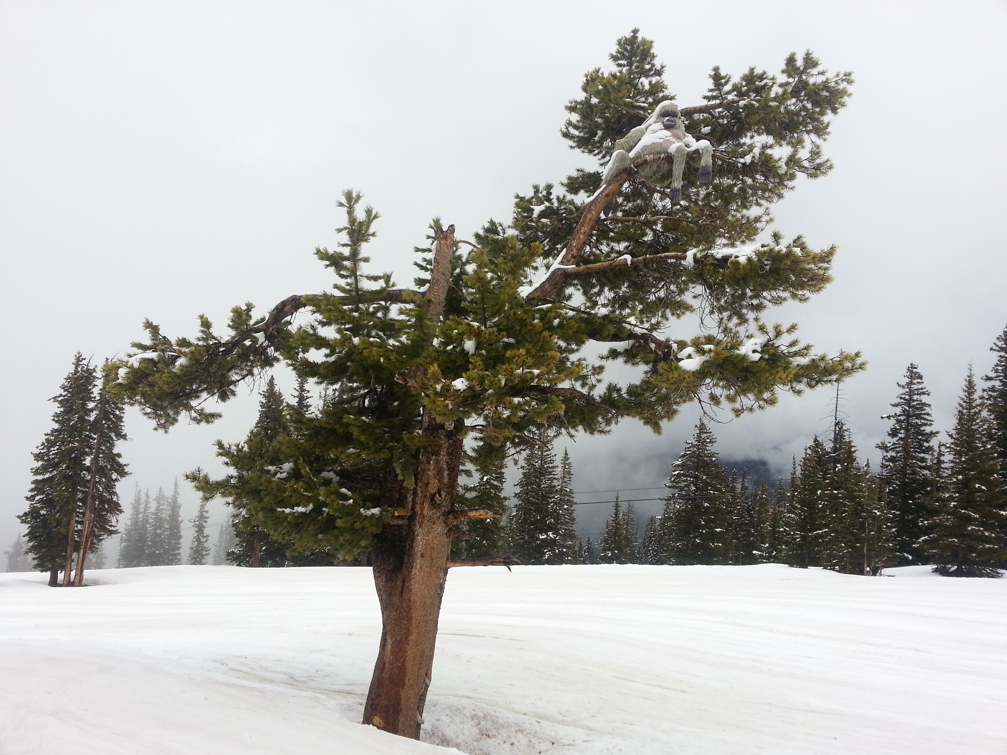 Aspen Mountain (aka Ajax) is open for the weekend!!! Still so much snow. Today a paraglider floated gently above the skiers. Yesterday I saw a gorilla(?) in the tree at the top of Lift Three – how long has that been there? I have never seen it before (see photo top right in tree) and suspect it is usually buried in snow. Friday I saw a fox cross the run by the base of Lift Three – I am told she has babies 🙂 A great weekend! I think if you left-click the photos you can zoom them.